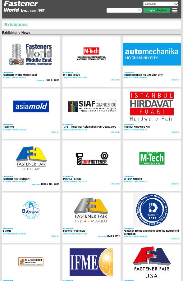 The year 2019 has come and you still have no idea about your next global marketing plans, or, still can’t find the most suitable approach to promote your products? Don’t worry. Fastener World has confirmed participation in up to 30 int’l fastener, hardware and industrial components trade shows in 2019, where we will act as a bridge to connect global buyers with high quality product and service providers. Click https://tinyurl.com/y8vh8xlc immediately to get more exhibition news only on Fastener World’s official website.