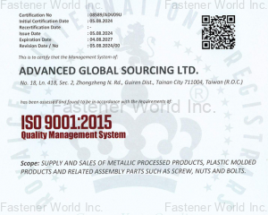 We represent more than thirty qualified manufacturers in Taiwan and sell worldwide. Our policy is to provide Quality Products, On Time with Competitive Pricing and to treat our customers and manufacturers fairly. It is with our excellent fastener and product knowledge, business philosophy, communication skills, and flexible service plans, we work to earn the trust of our customers and suppliers. After building that trust, we continue to work closely with our customers and manufacturers to grow our business together.