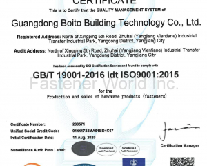 Guangdong Boito Construction Technology Co., Ltd. was established in 2006 and is located in Vientiane Industrial Park, Yangdong City, Yangjiang City, Guangdong Province. It covers an area of 13,333 square meters with a construction area of about 10,000 square meters. It has an investment of 100 million yuan, an annual production capacity of 8,000 tons, and an annual output value of about 150 million yuan. Boito company produces and sells various high-quality fastener series products, and provides excellent services for middle and high-end customers.