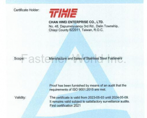 Chan Hwei Enterprise Co., LTD. is one of the subsidiaries of TONG HWEI GROUP with over 46 years of stainless steel fasterner manufacture and technical experience.