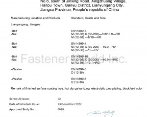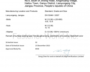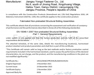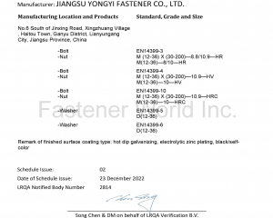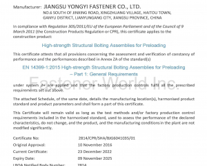 江蘇甬怡緊固件有限公司是一家專業生產高性能連接副螺栓和高性能大規格螺栓的企業。生產基地位於江蘇省連雲港市,佔地180畝,廠房面積80000平方米。總員工200多人,其中高級管理人才超過30人,高級技術人才超過60人,熟練的操作工超過100人。通過了CQC ISO9001:2015質量體系認證,率先建立ISO/IEC17025標準實驗室,另有針對出口業務申請的CE、UKCA認證,針對國內業務申請的中國船級社船用產品證書等。與歐美知名企業長期保持友好合作關係,如:Reyher, Wurth 等,並供應給GE,Siemens等品牌。產品全工序自己生產,工匠團隊製造經驗超過30年。中國高性能大螺栓製造專家,中國高性能連接副螺栓出口歐洲領導者,所有銷售的產品進行產品質量責任險參保。